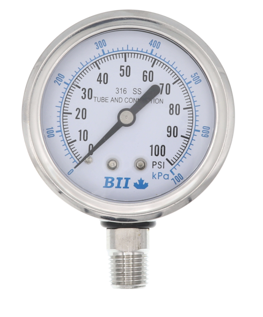 High quality liquid filled pressure gauge rated. Measures pressure from 0-100 PSI. This is not the OEM part, but is a top quality replacement gauge for any of the Kifco provided pressure gauges.